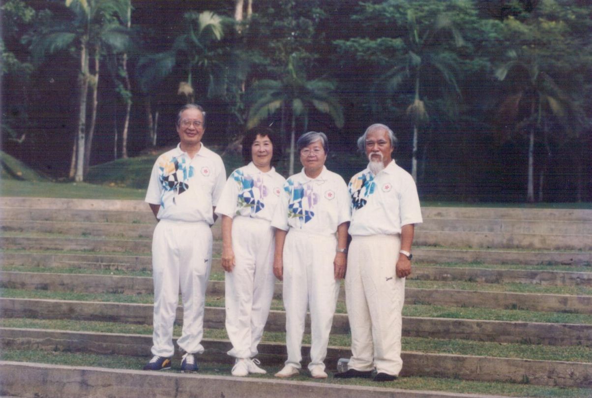 吴岸(右一)与夫人黄惠卿及诗人田宁夫妇,在练气功后留影。