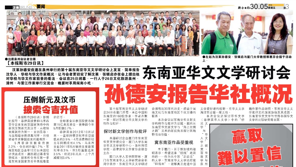 東南亞華文文學研討會 其它留言 2024东南亚诗歌奖评选揭晓 本会常务理事王涛荣获中国当代诗人杰出贡献金奖 馬來西亞风雅颂诗社成立 2022年新加坡大专文学奖诗歌得奖者 印尼名詩人顧長福逝世 第二届新华青年文学奖 泰國名詩家嶺南人逝世 新加坡名詩人秦林逝世 2019年新加坡大专文学奖诗歌组得奖者 第五屆理事會 新华文学青年诗歌奖 首届国际微诗大赛公告 第六届印华“金鹰杯”东南亚华文微型小说创作大赛 胡志明市華文文學會選出第四屆執委 台灣著名詩人洛夫逝世